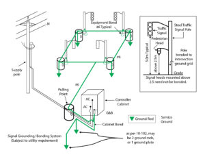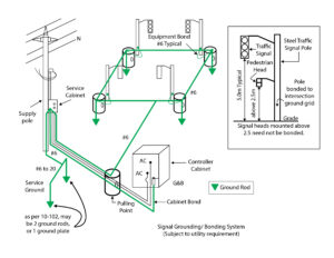 One typical grounding and bonding schematic for a traffic signal system that is acceptable in the Province of Saskatchewan.